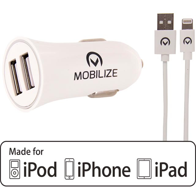 Mobilize Car Charger 2x USB 24W + USB to Apple MFi Lighting Cable 1m. White